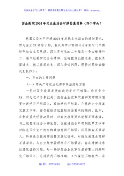 / 国企副职2024年民主生活会对照检查材料(四个带头)
