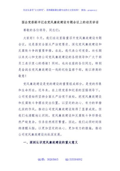 / 国企党委副书记在党风廉政建设专题会议上的动员讲话