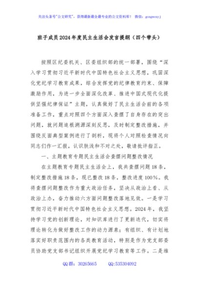 / 班子成员2024年度民主生活会发言提纲(四个带头)