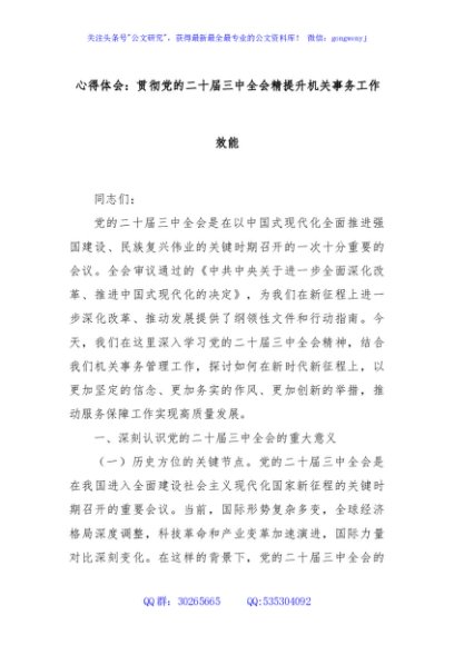 / 心得体会:贯彻党的二十届三中全会精提升机关事务工作效能