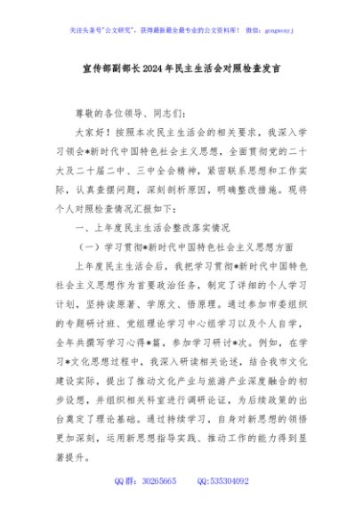 / 宣传部副部长2024年民主生活会对照检查发言
