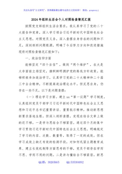 / 2024年组织生活会个人对照检查情况汇报