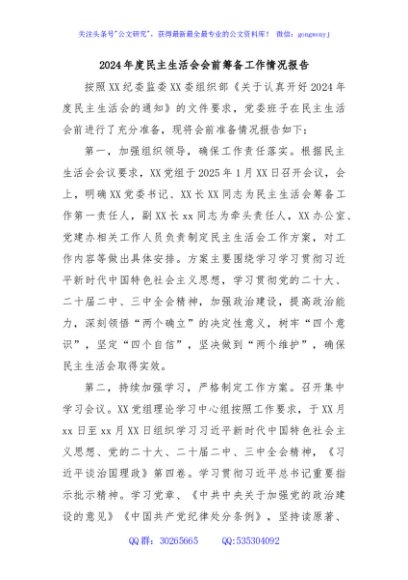 / 2024年度民主生活会会前筹备工作情况报告