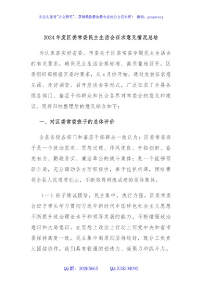 / 2024年度区委常委民主生活会征求意见情况总结