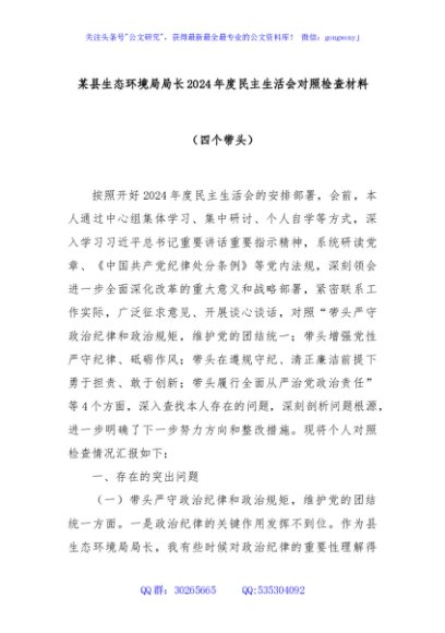 / 某县生态环境局局长2024年度民主生活会对照检查材料(四个带头)