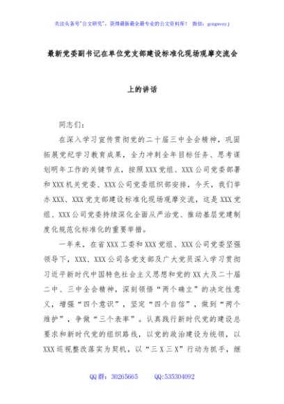 / 最新党委副书记在单位党支部建设标准化现场观摩交流会上的讲话