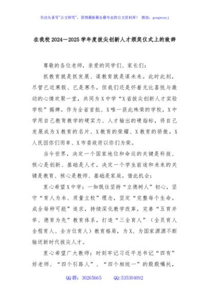 / 在我校2024-2025学年度拔尖创新人才颁奖仪式上的致辞