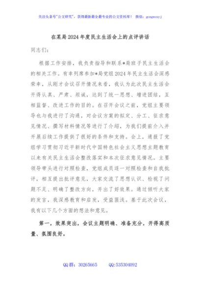 / 在某局2024年度民主生活会上的点评讲话