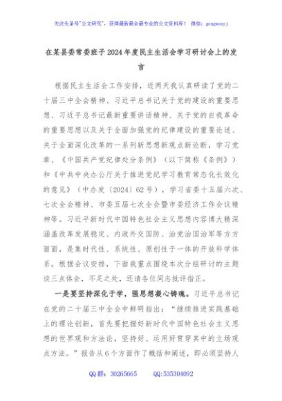/ 在某县委常委班子2024年度民主生活会学习研讨会上的发言