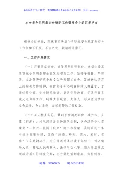 / 在全市今冬明春安全稳定工作调度会上的汇报发言