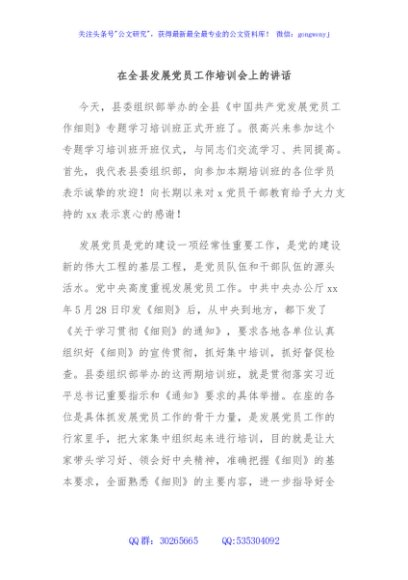 / 在全县发展党员工作培训会上的讲话