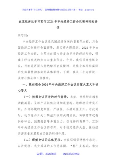 / 在党组传达学习贯彻2024年中央经济工作会议精神时的讲话