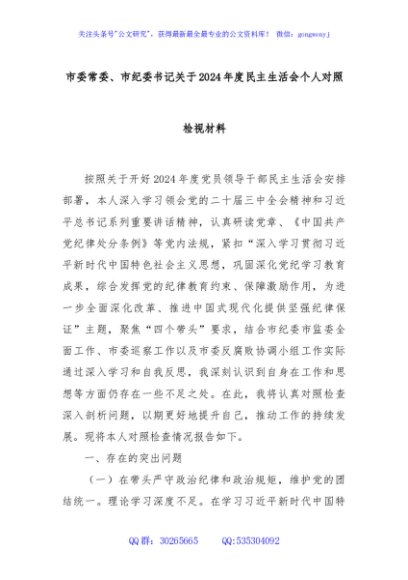 / 市委常委、市纪委书记关于2024年度民主生活会个人对照检视材料