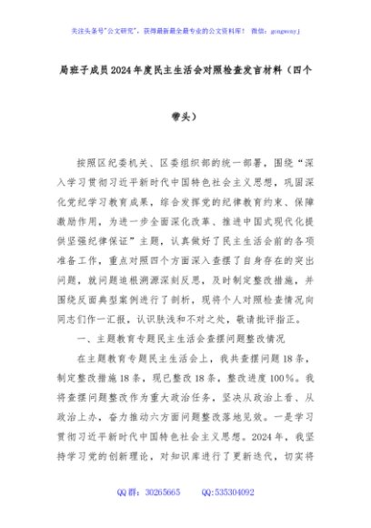 / 局班子成员2024年度民主生活会对照检查发言材料(四个带头)