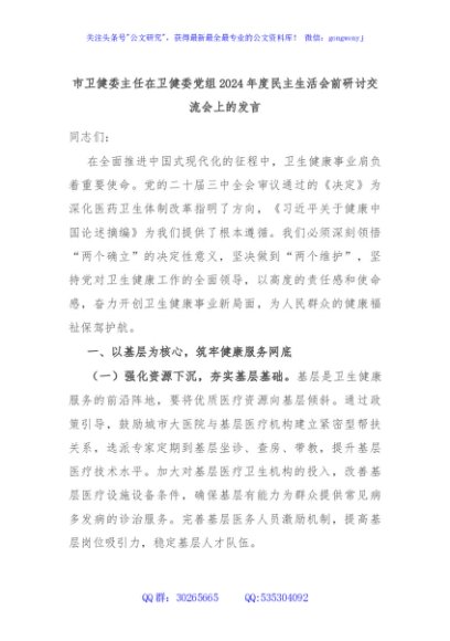 / 市卫健委主任在卫健委党组2024年度民主生活会前研讨交流会上的发言