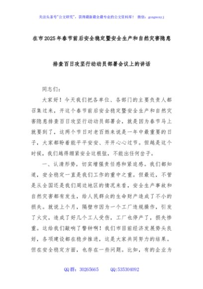 / 在市2025年春节前后安全稳定暨安全生产和自然灾害隐患排查百日攻坚行动动员部署会议上的讲话