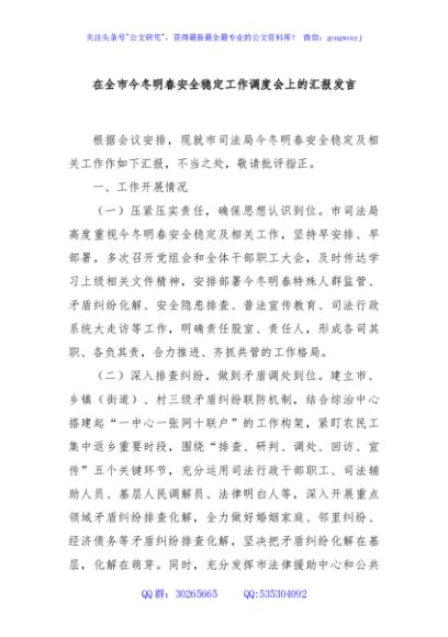 / 在全市今冬明春安全稳定工作调度会上的汇报发言