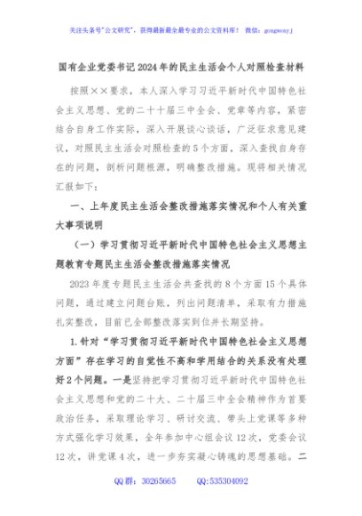 / 国有企业党委书记2024年的民主生活会个人对照检查材料