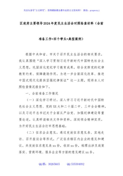 / 区政府主要领导2024年度民主生活会对照检查材料(会前准备工作+四个带头+典型案例)