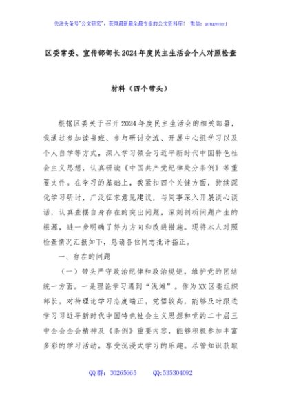 / 区委常委、宣传部部长2024年度民主生活会个人对照检查材料(四个带头)