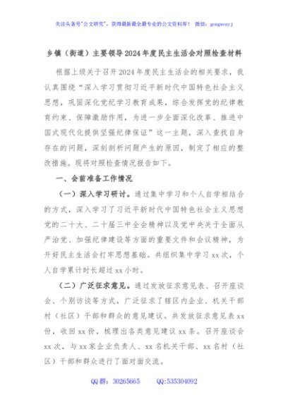 / 乡镇(街道)主要领导2024年度民主生活会对照检查材料