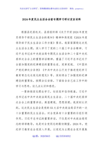 / 2024年度民主生活会会前专题学习研讨发言材料