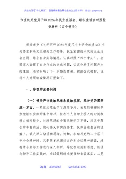 / 市直机关党员干部2024年民主生活会、组织生活会对照检查材料(四个带头)