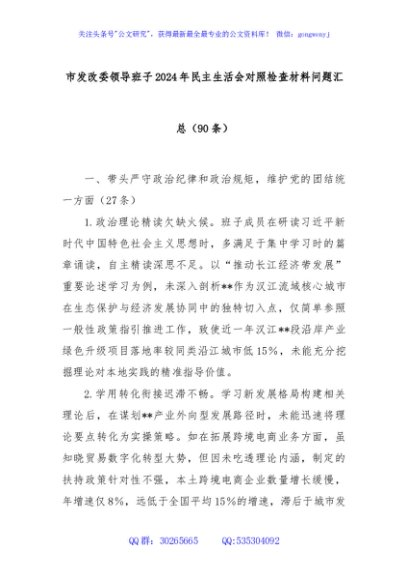 / (90条)市发改委领导班子2024年民主生活会对照检查材料问题汇总