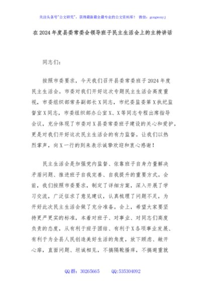 / 在2024年度县委常委会领导班子民主生活会上的主持讲话