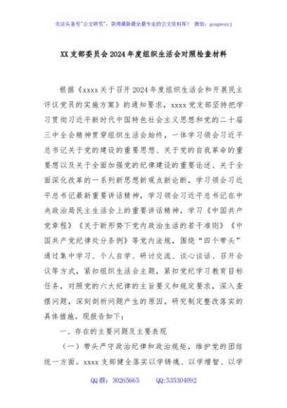 / XX支部委员会2024年度组织生活会对照检查材料
