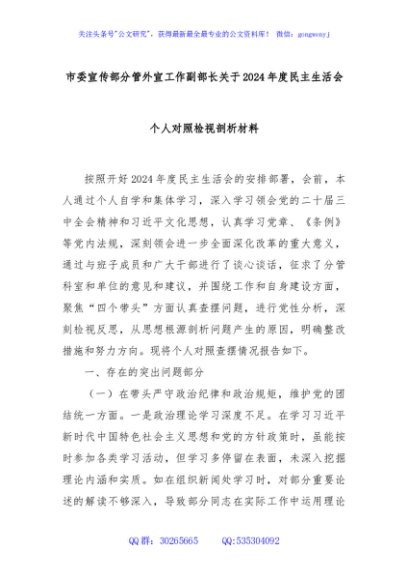 / 市委宣传部分管外宣工作副部长关于2024年度民主生活会个人对照检视剖析材料
