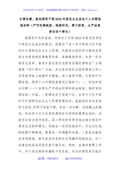 分管住建、 规划领导干部 2025 年度民主生活会个人对照检视材料(严守纪律规矩、 砥砺作风、 勇于担责、 从严治党责任四个带头)