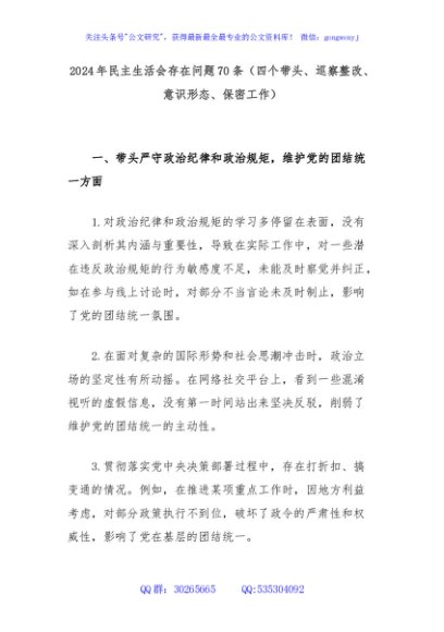 / 2024年民主生活会存在问题70条(四个带头、巡察整改、意识形态、保密工作)