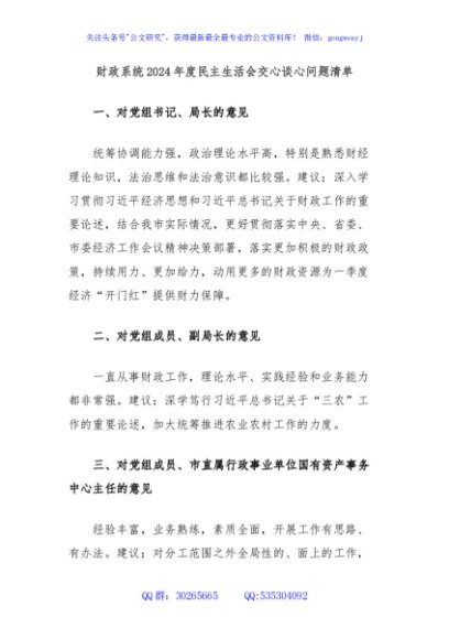 / 财政系统2024年度民主生活会交心谈心问题清单