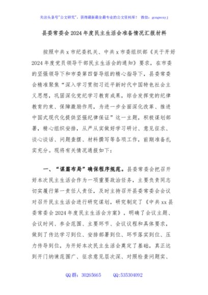 / 县委常委会2024年度民主生活会准备情况汇报材料