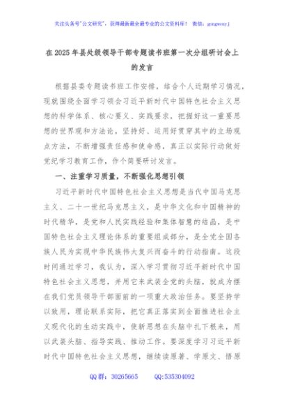 / 在2025年县处级领导干部专题读书班第一次分组研讨会上的发言