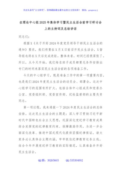 / 在理论中心组2025年集体学习暨民主生活会前学习研讨会上的主持词及总结讲话