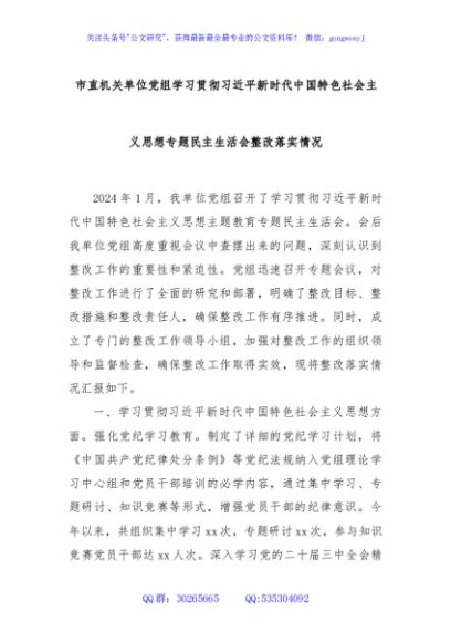 市直机关单位党组学习贯彻习近平新时代中国特色社会主义思想专题民主生活会整改落实情况