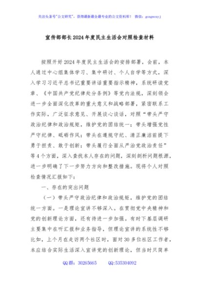 / 宣传部部长2024年度民主生活会对照检查材料
