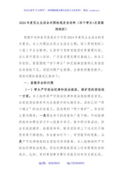 / 2024年度民主生活会对照检视发言材料(四个带头+反面案例剖析)