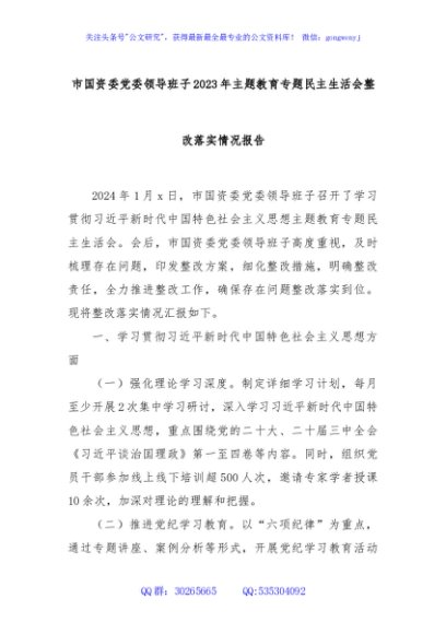 / 市国资委党委领导班子2023年主题教育专题民主生活会整改落实情况报告