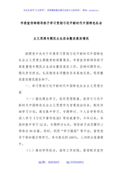 / 市委宣传部领导班子学习贯彻习近平新时代中国特色社会主义思想专题民主生活会整改落实情况