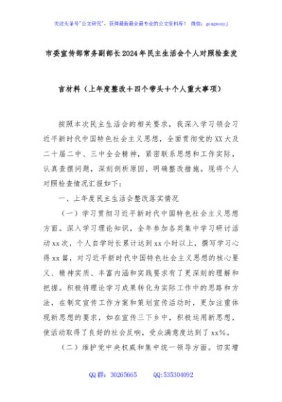 / 市委宣传部常务副部长2024年民主生活会个人对照检查发言材料