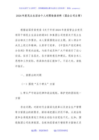 / 2024年度民主生活会个人对照检查材料(国企公司主管)