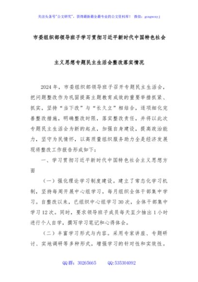 / 市委组织部领导班子学习贯彻习近平新时代中国特色社会主义思想专题民主生活会整改落实情况
