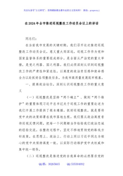 / 在2024年全市推进巡视整改工作动员会议上的讲话