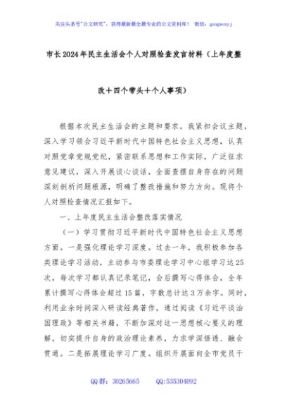 / 市长2024年民主生活会个人对照检查发言材料(上年度整改+四个带头+个人事项)