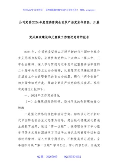 / 公司党委2024年度党委落实全面从严治党主体责任、开展党风廉政建设和反腐败工作情况总结的报告