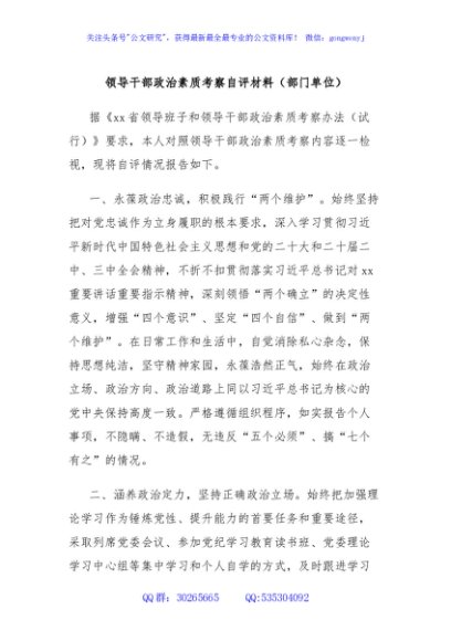 / 领导干部政治素质考察自评材料(部门单位)