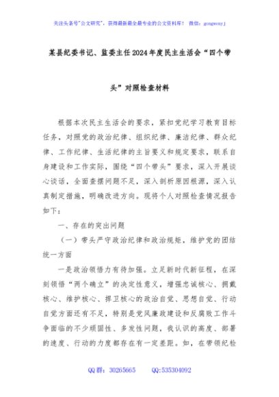/ 某县纪委书记、监委主任2024年度民主生活会“四个带头”对照检查材料